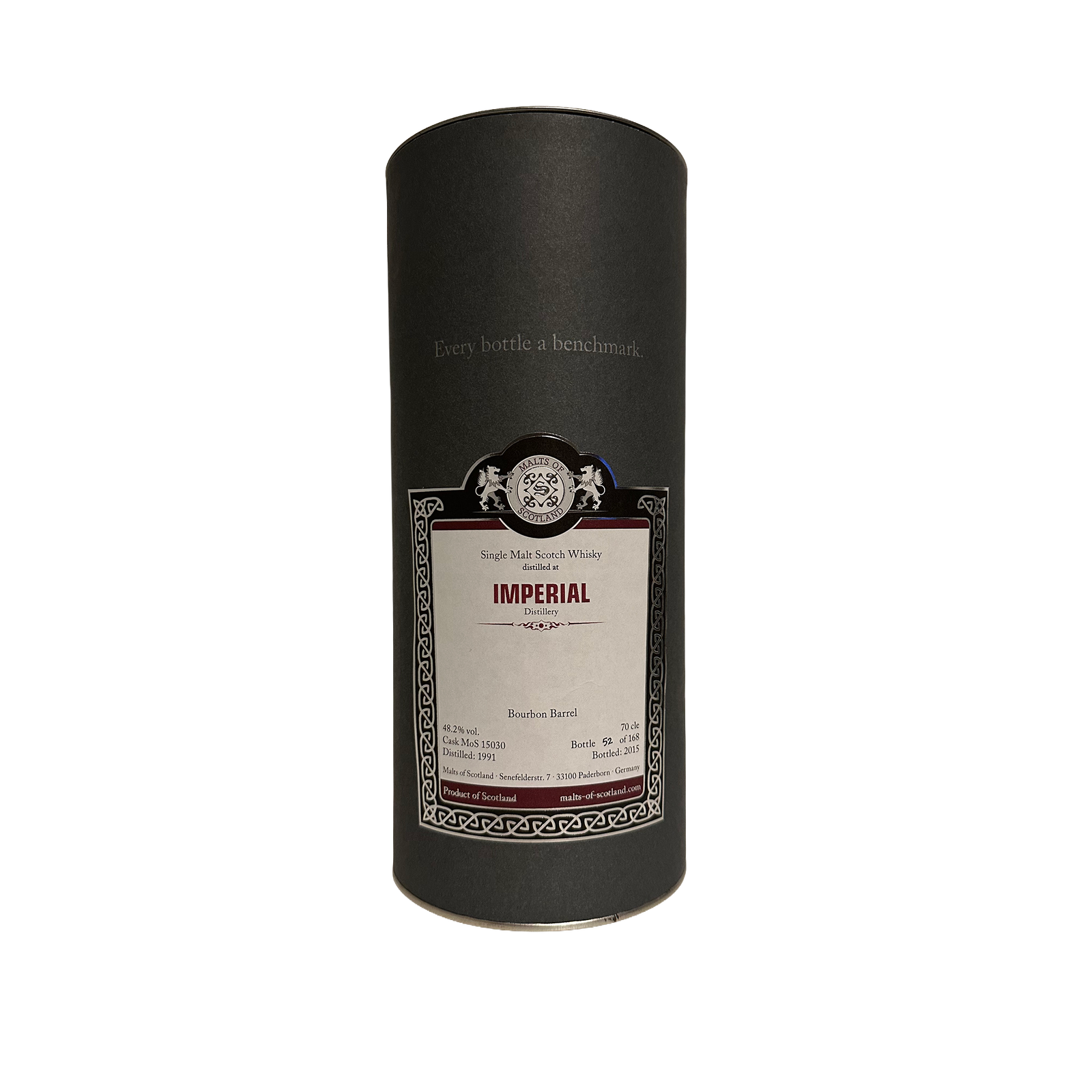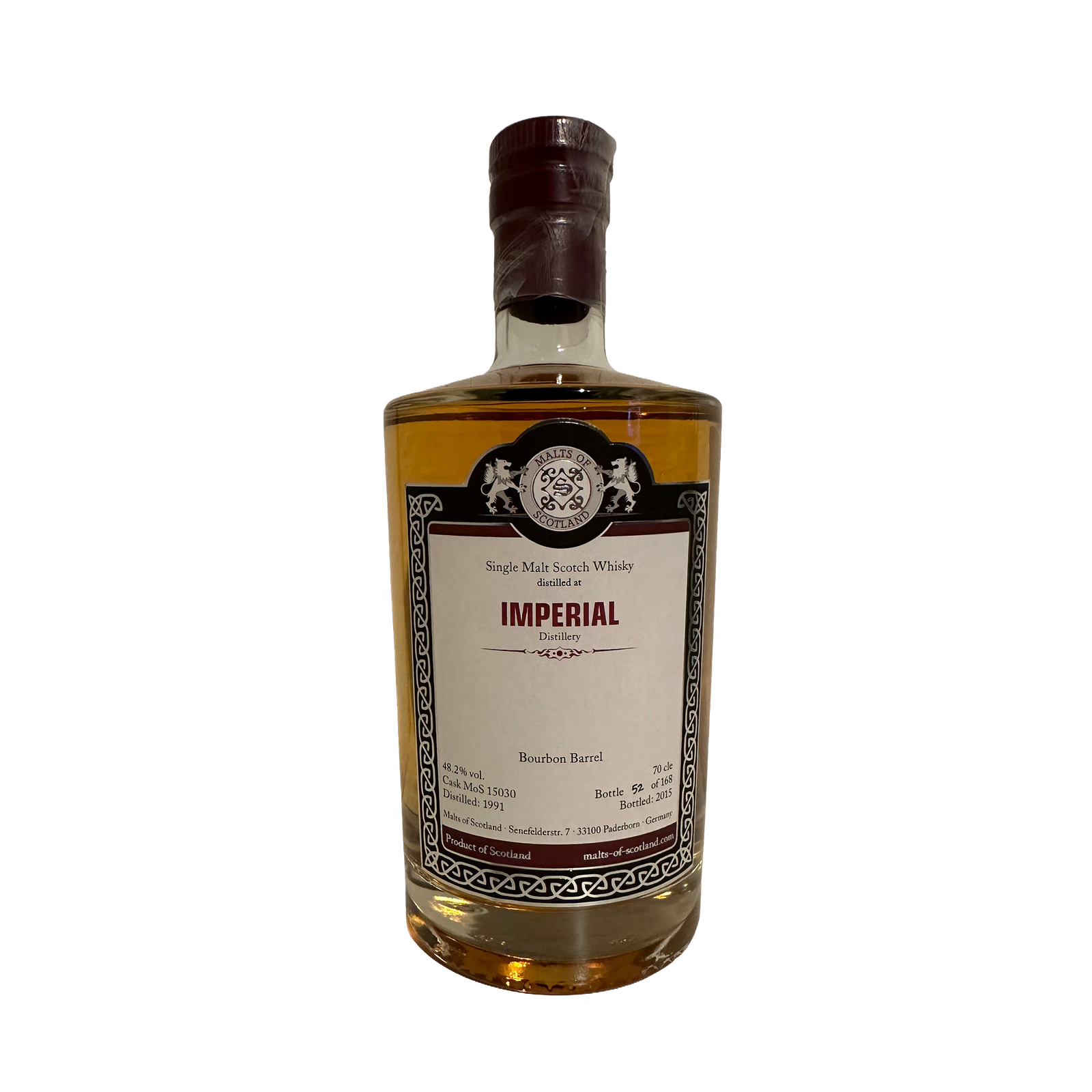 LOST DISTILLERY: Imperial | Bottled by: Malts of Scotland |. Single Cask (Cask No MOS 15030) | Cask: Bourbon Barrel | Distilled: 1991 | Bottled: 2015 | ABV: 48.2 % | Content: 700 ml | Bottle No. 52 from 168 total